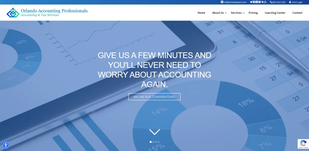 Questo sito web contabile ha una rilassante combinazione di colori blu. Inoltre, avere un carattere piccolo e grigio è in tutto il sito mantenendo la pagina semplice e consentendo che ci sia molto spazio bianco attorno al contenuto che ha un'atmosfera rilassante. Molti CTA sono pronti ad aumentare le conversioni e consentono alle persone di raggiungere maggiori informazioni. Il loro numero di telefono è visibile sotto il nome del marchio, che segue i visitatori con un'intestazione adesiva.