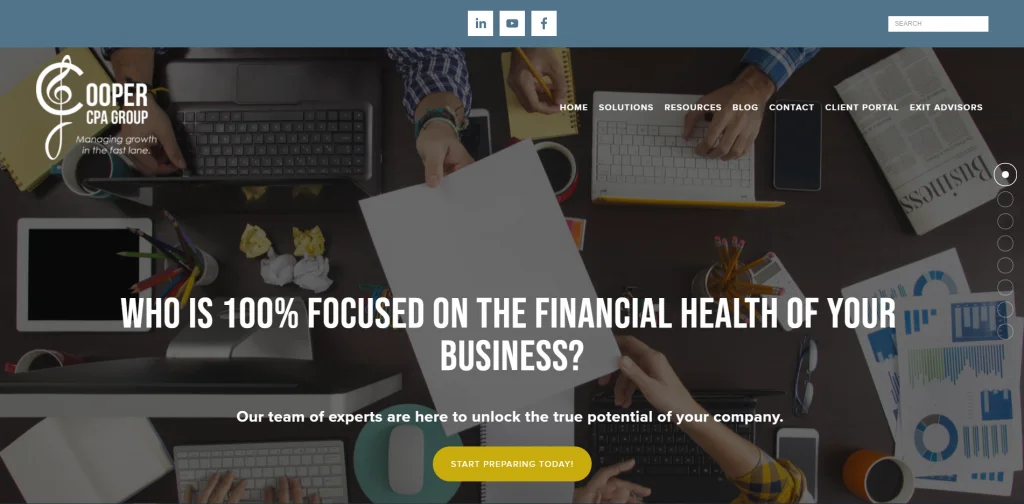 Il sito Web di Cooper CPA Group è in grassetto con un carattere grande e maiuscolo che raggiunge il pubblico facendo una domanda. Molti CTA forti con un colore giallo brillante, che aiutano a portare l'attenzione su quei collegamenti. Alcune altre domande vengono poste con la speranza di mantenere l'attenzione dei visitatori e farli pensare a ciò di cui hanno bisogno. C'è un buon rapporto tra contenuto scritto e immagini. Ciò aiuta a mantenere i potenziali clienti interessati alle informazioni condivise.