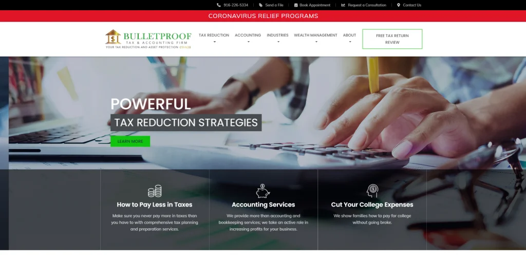 Questo sito Web utilizza colori verde brillante per evidenziare i suoi CTA, sperando di aumentare le conversazioni e i lead. Ciò consente ai visitatori di raggiungere facilmente ulteriori informazioni. Inoltre, mantenendo il colore coerente attraverso il sito web. Ci sono molti modi per entrare in contatto con Bulletproof Tax & Accounting Firm con i loro numeri di telefono, link ai social media e un modulo di contatto.