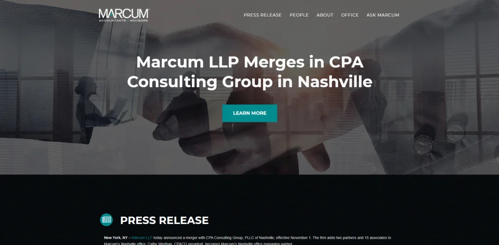 Marcum usa colori di sfondo più scuri e poi usa il blu per evidenziare le informazioni. Il blu risalta davvero sullo sfondo scuro. Tutte le informazioni sono all'interno di una pagina e i collegamenti in alto ti portano alle informazioni sulla pagina. Ciascuno dei titoli è un carattere in grassetto e lettere maiuscole con una semplice icona blu che aiuta ad attirare l'attenzione su di esso.