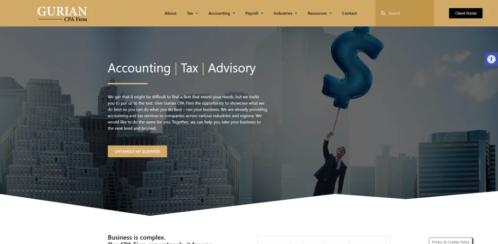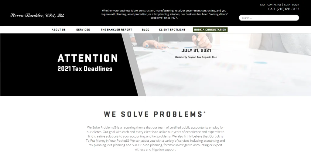 John J. Griffin offre anche servizi fiscali, il sito web ha un'ottima organizzazione ed è facile trovare il servizio necessario. Ci sono alcune categorie nella parte superiore della pagina e un'altra sezione nel mezzo della homepage che elenca tutti i servizi. All'interno della homepage, il visitatore può compilare un form per ricevere una consulenza. Alcune testimonianze dei clienti sono presenti nella homepage e il resto è nella scheda Informazioni.