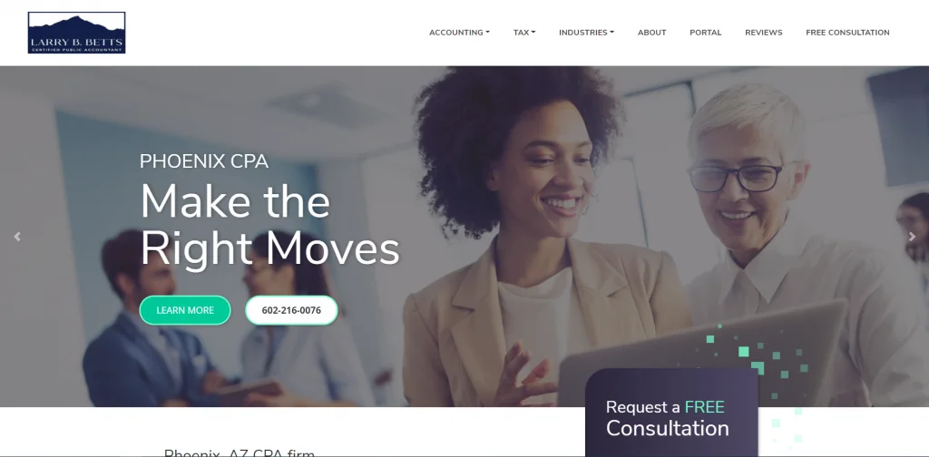 Larry B. Betts è un altro ottimo esempio di un sito Web che va dritto al punto e fornisce le informazioni necessarie agli spettatori. La homepage ha diversi blocchi di colori di sfondo che aiutano la pagina a non diventare opprimente. Sulla homepage, c'è un paragrafo introduttivo approfondito, i servizi che offrono e risorse utili per i clienti. Tutti i servizi sono elencati nella parte superiore della pagina, facilitando la scoperta di informazioni importanti.