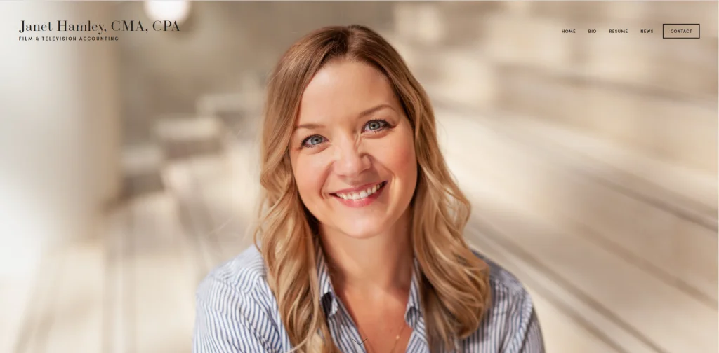Questo sito è semplice con alcune foto del proprietario e un'introduzione come prima cosa sulla homepage. Da subito si chiarisce che il titolare è un contabile cinematografico e televisivo. Janet Hamley vuole essere sicura di non far perdere tempo a nessuno, quindi chiarisce cosa offre. Ci sono collegamenti nella parte superiore della pagina, quindi i visitatori possono raggiungere ulteriori informazioni, come articoli di notizie, un curriculum e la sua biografia.