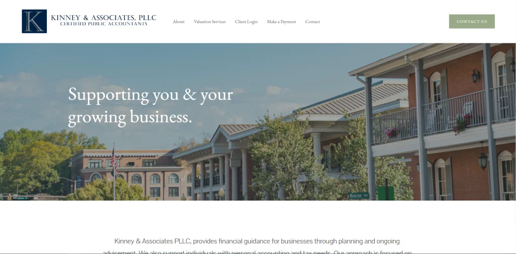 Kinney & Associates ha una combinazione di colori blu e verde che funzionano bene insieme. I servizi sono visibili in homepage con semplici icone. Condividono la storia dell'azienda, che inizia a creare fiducia con il potenziale cliente. Molte risorse utili per i clienti come un'opzione di pagamento e un portale clienti. Nella loro scheda "Informazioni", ci sono le presentazioni del loro team e il tipo di approccio che adottano.