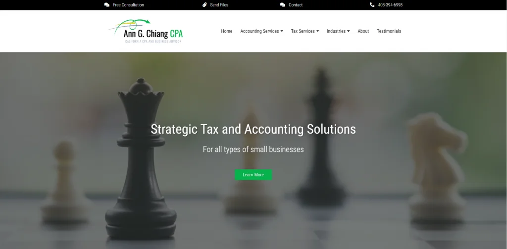 Ann G. Chiang CPA ha un sito Web attraente con alcuni design di carte che aiutano a mantenere le cose organizzate. Le loro informazioni di contatto sono visibili nella parte superiore e inferiore di ogni pagina. Un effetto hover viene utilizzato con alcune delle loro immagini per mostrare più informazioni e rendere la loro pagina più interessante e mantenere i visitatori interessati. Inoltre, le categorie sono organizzate molto bene mostrando i servizi che offrono e i settori in cui sono specializzati.