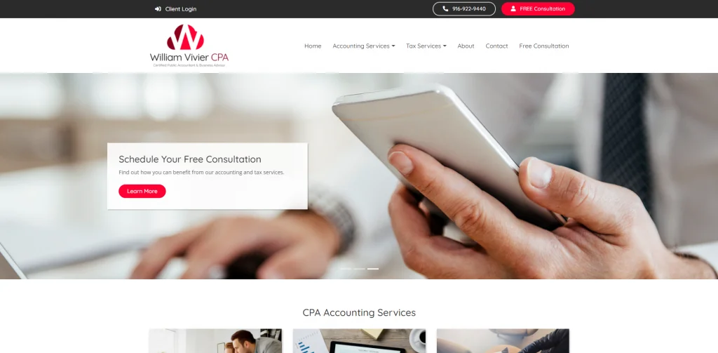 Il sito web di William Vivier è molto pulito e senza soluzione di continuità. Ha anche un display organizzato con i suoi diversi servizi utilizzando un design della carta. Alcuni CTA diversi sono evidenziati con un colore rosso brillante. Offrono una consulenza gratuita, l'iscrizione alla newsletter e un modo per inviare file protetti sulla loro pagina di contatto. Hanno i loro servizi contabili e fiscali in diverse sezioni, quindi è più facile per le persone trovare quello che stanno cercando.