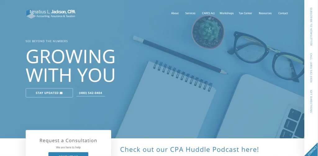 Guerrero CPA ha un banner giallo brillante nella parte superiore della pagina. Il loro design è creativo, il che aiuta questo sito Web di contabili a distinguersi da altri simili. Ci sono molte risorse utili sia per i clienti nuovi che per quelli di ritorno. Il loro numero di telefono ed e-mail sono visibili nella parte superiore della pagina, insieme ai collegamenti ai social media per rimanere in contatto con loro e vedere alcune delle loro recensioni.