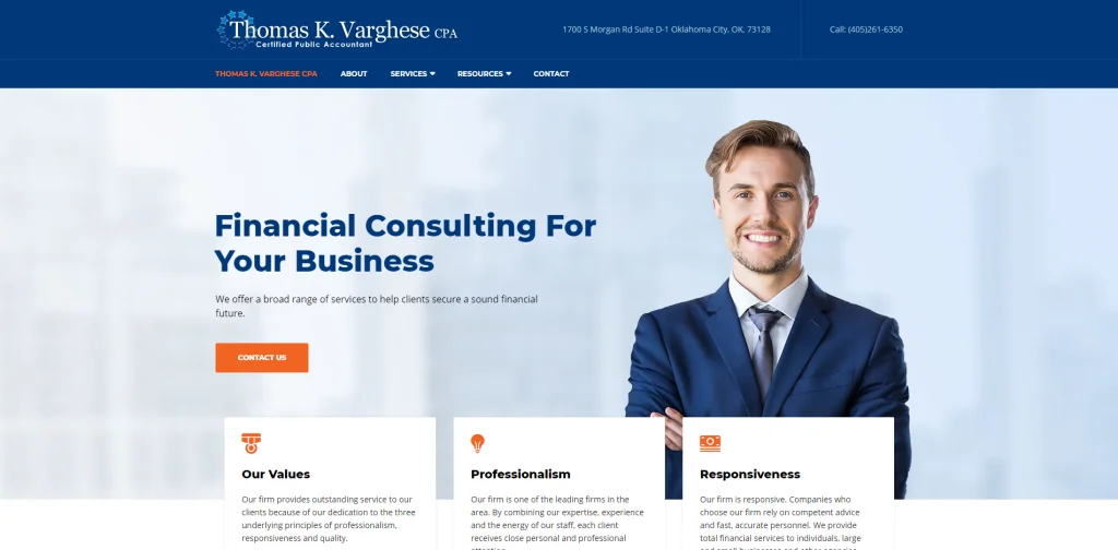 Thomas K. Varghese ha una combinazione di colori blu e arancione. Molte caselle e icone vengono utilizzate per organizzare le informazioni. Questo sito web per ragionieri è semplice e si concentra su come possono aiutarti. Usano immagini grandi e caratteri grandi per presentare i servizi che offrono. Un modulo di contatto e testimonianze sono visibili in fondo alla pagina. Inoltre, ci sono collegamenti ai social media, come Facebook e Twitter. Quindi le persone possono connettersi con l'azienda in più di un modo.