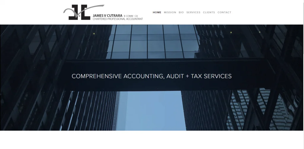 La homepage di James V Cutrara è molto semplice. Con molto spazio bianco e poche immagini. I collegamenti ai servizi, alla biografia e alle informazioni di contatto sono elencati nella home page. Inoltre, ulteriori informazioni da scoprire nella parte superiore della pagina. C'è una mappa di Google, collegamenti ai social media, un numero di telefono visibile in fondo alla pagina.