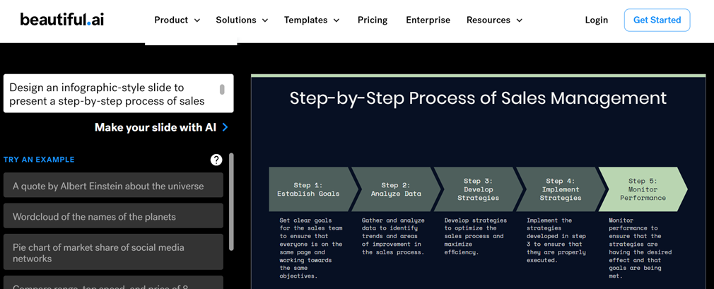 Abbiamo suggerito a beautiful.ai di "progettare una diapositiva in stile infografica per presentare un processo di gestione delle vendite passo dopo passo". Ecco il risultato che ha generato: