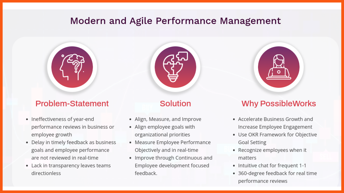Mantieni i tuoi dipendenti motivati e coinvolti con incentivi e premi basati sulle loro prestazioni e misura le loro prestazioni con il robusto software PMS di PossibleWorks. Stabilisci l'obiettivo e chiarisci al dipendente il suo compito. Un obiettivo chiaro assegnato a un dipendente aumenterà l'efficienza e lo manterrà motivato.