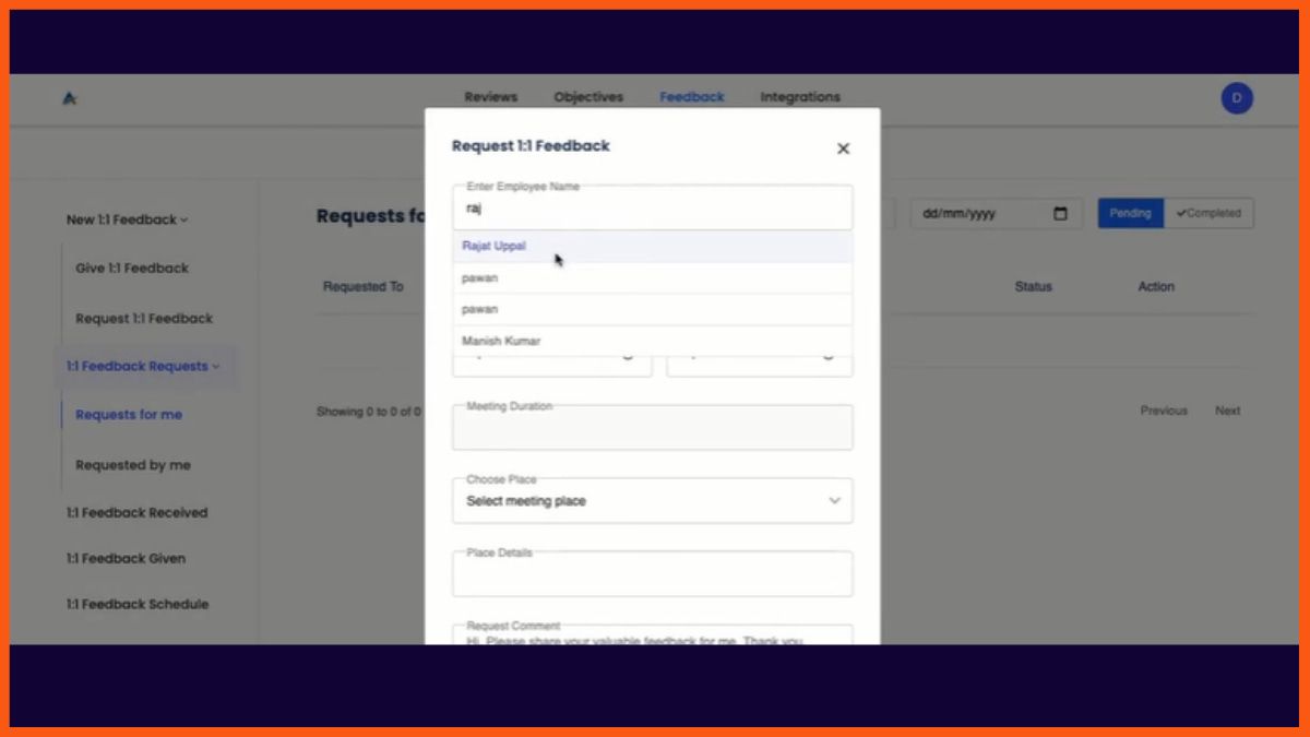 Revisione del feedback 1 su 1 per condividere feedback importanti su qualsiasi dipendente dell'organizzazione prima del tempo di revisione. Si può facilmente richiedere un feedback per le loro prestazioni passate su qualsiasi lavoro specifico. Ciò creerà un flusso continuo di feedback che alla fine aiuterà il software a fornire i migliori risultati.