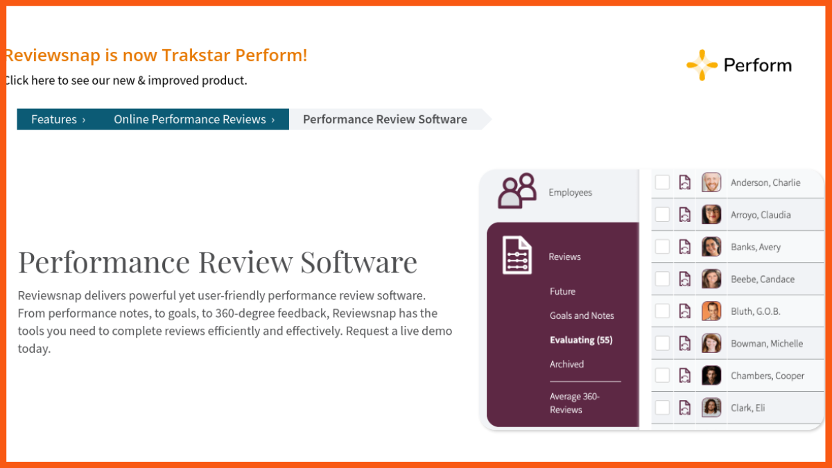 ReviewSnap è un'altra grande aggiunta alla nostra lista. Con il suo approccio incentrato sulle prestazioni per fornire il miglior servizio per obiettivi, feedback, revisione e valutazione, questo software è perfetto per gestire le prestazioni dei tuoi dipendenti. Qualunque sia l'obiettivo del tuo obiettivo, aiuta a raggiungerlo monitorandolo in qualsiasi momento.