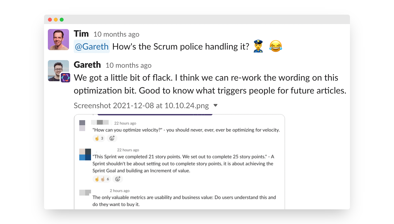 - Passione personale. Nonostante la nostra iniziale limitata familiarità con l'agile, Gareth e io siamo entrambi manager in via di guarigione trasformati in marketer di contenuti. Abbiamo sperimentato organizzazioni tradizionali disfunzionali e condividiamo la passione per lo studio della produttività, delle pratiche di gestione e dello sviluppo del prodotto, tutti temi legati all'agile. Questo interesse personale ci ha motivato a leggere libri, seguire corsi e connetterci con le persone nella comunità agile.