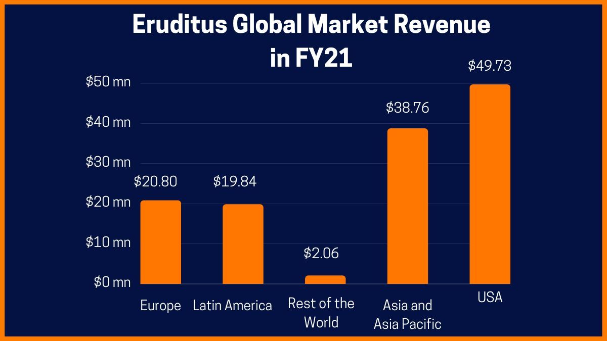 Le spese della società sono state registrate a $ 117,1 milioni nel FY20, che sono diventate $ 397,4 milioni nel FY21. Per quanto riguarda i profitti e le perdite, la società, che ha registrato una perdita di 39,2 milioni di dollari nel FY20, ha visto le sue perdite salire a 264,2 milioni di dollari durante il FY21. Considerando le operazioni globali di Eruditus, il mercato più grande dell'azienda in termini di ricavi è quello degli Stati Uniti, che hanno contribuito per 49,73 milioni di dollari e hanno rappresentato il 38% dei ricavi registrati nell'esercizio 21.