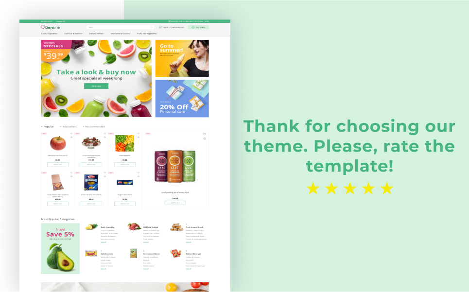 Questo tema della spesa Magento è gratuito e ti permetterà di creare un negozio online di fascia alta. In esso, come nei modelli precedenti, gli sviluppatori utilizzano le ultime tendenze web. La combinazione di attrattiva e funzionalità si ottiene senza un sovraccarico di effetti visivi, il che garantisce un elevato carico del sito. La flessibilità di questo tema Magento gratuito per negozi di alimentari rende facile adattarlo alle esigenze di qualsiasi negozio. Con menu e layout strutturati, i tuoi contenuti saranno più organizzati e coinvolgenti.