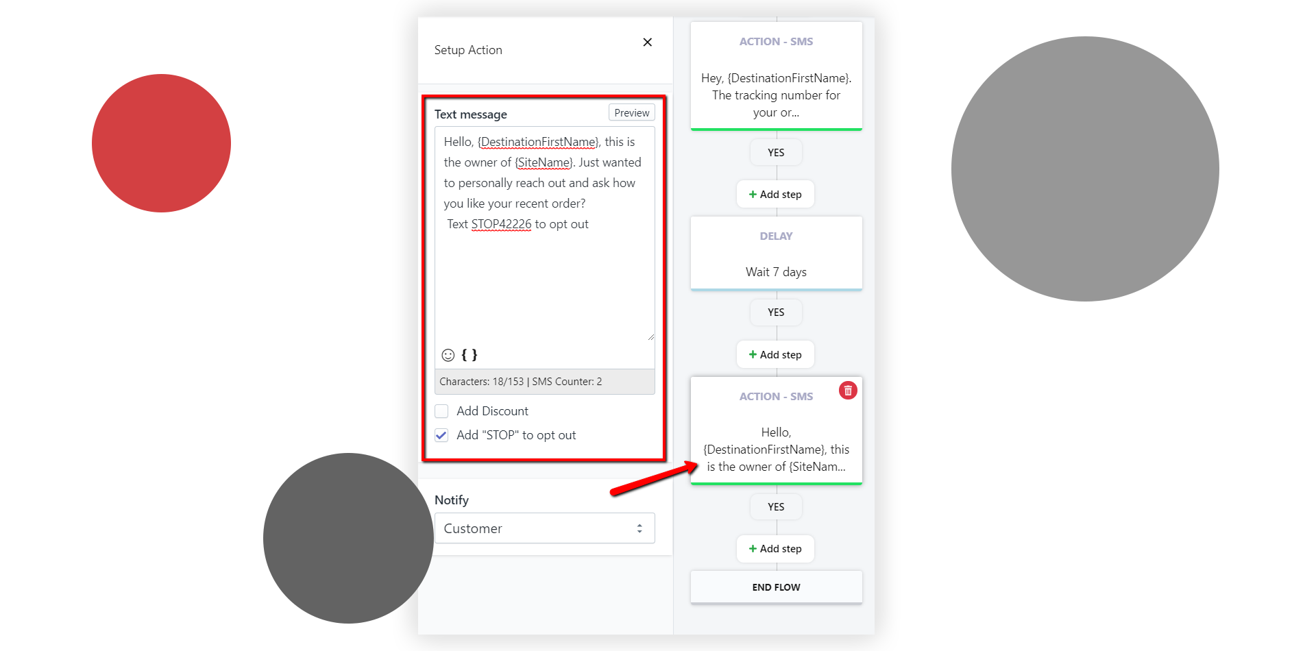 Questa è la parte in cui puoi far risaltare il tuo negozio dalla concorrenza. Mostra maggiore attenzione chiedendo al cliente un feedback, sul prodotto o sull'intera esperienza. Uno studio recente ha mostrato che il 42% dei clienti preferirebbe chattare dal vivo con un rivenditore piuttosto che scrivere un'e-mail. Mandargli un SMS apre un canale diretto per la comunicazione.