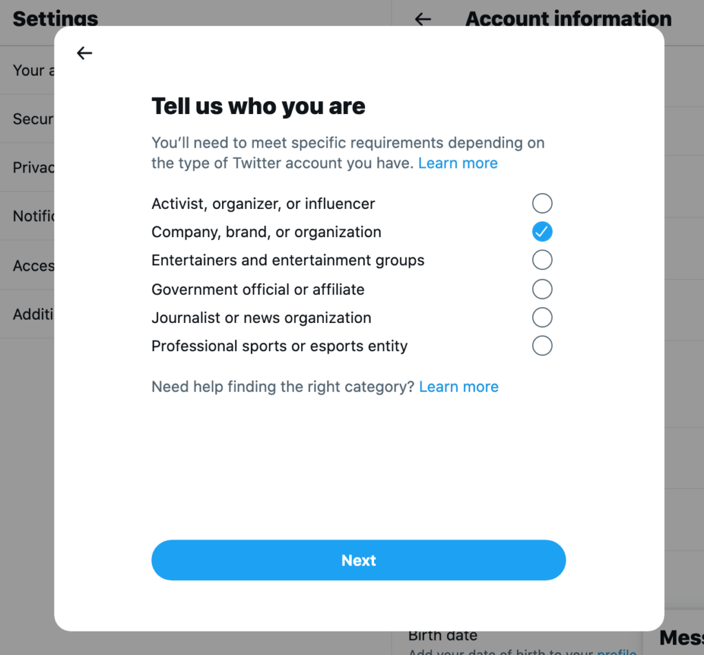 Ora che sei arrivato così lontano, il tuo percorso divergerà dagli altri nel loro personale viaggio di verifica su Twitter. Da qui, daremo un'occhiata ai passaggi necessari per richiedere la verifica per ciascuna categoria insieme alle informazioni di supporto che dovrai includere.