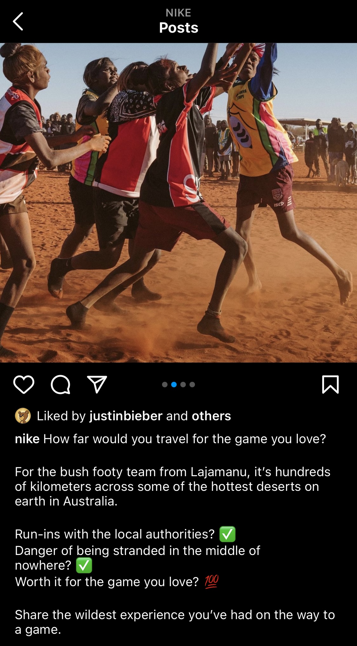 L'account @Nike, ad esempio, è bravo a creare una didascalia di narrazione significativa che apra anche la discussione per il loro pubblico nei commenti o li spinga a condividere nuovamente la storia sulle loro storie.