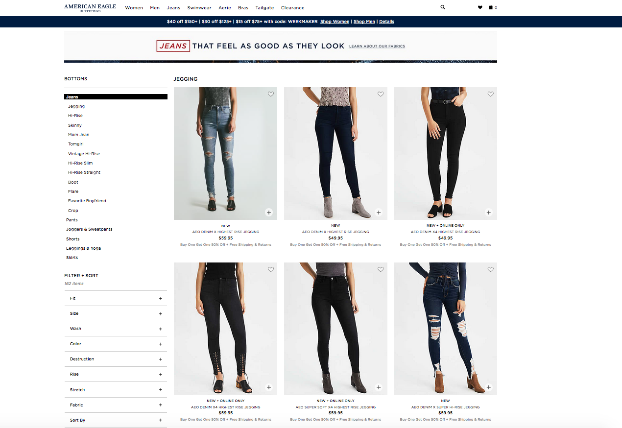 Le anteprime dei video dei prodotti possono essere visualizzate al passaggio del mouse, direttamente nel catalogo prodotti. Ecco come American Eagle lo ha implementato: