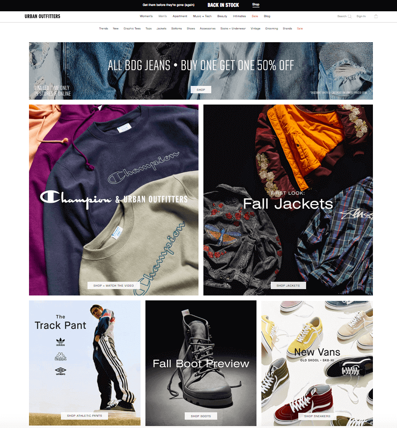 Nella categoria principale, Urban Outfitters utilizza immagini accattivanti per presentare diversi marchi e tipi di abbigliamento. L'immagine è cliccabile.