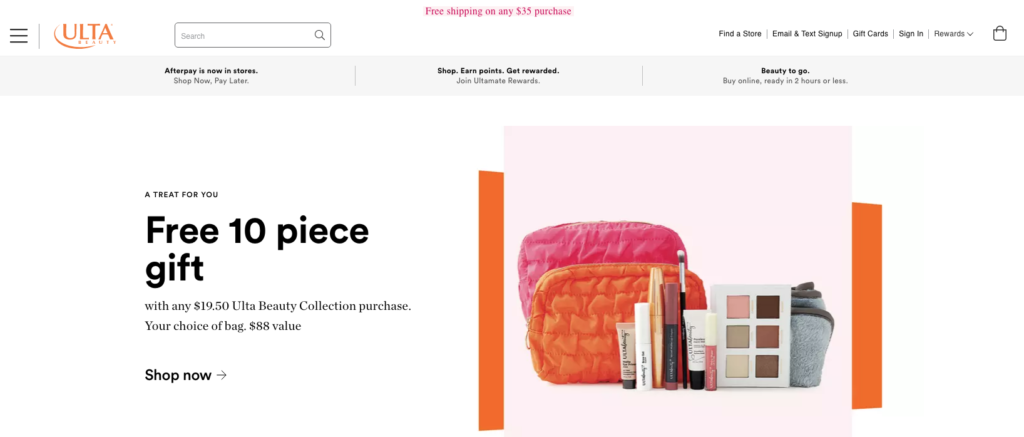 Un altro ottimo modo per convincere i clienti ad acquistare è regalare un regalo. Offri ai tuoi clienti coupon che consentano loro di acquistare determinati articoli o di acquistare un determinato importo in dollari dei tuoi prodotti e, quando lo fanno, ricevono un regalo gratuito. Ulta fa un ottimo lavoro in questo.