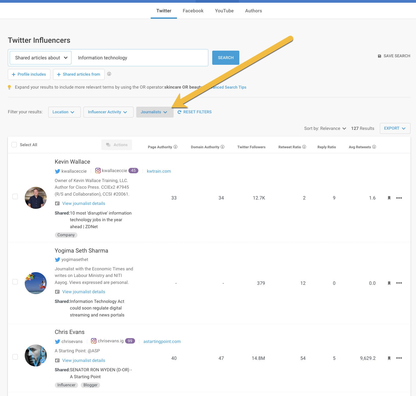 Includi i tuoi giornalisti locali e/o di nicchia in quel feed di monitoraggio per ascoltare ciò che hanno da dire, di cui scrivono e cosa chiedono. In molti casi, sarai in grado di suggerire angoli di cui potrebbero essere interessati a scrivere in base a ciò che stanno twittando. Buzzsumo è un ottimo modo per trovare quei giornalisti su Twitter:
