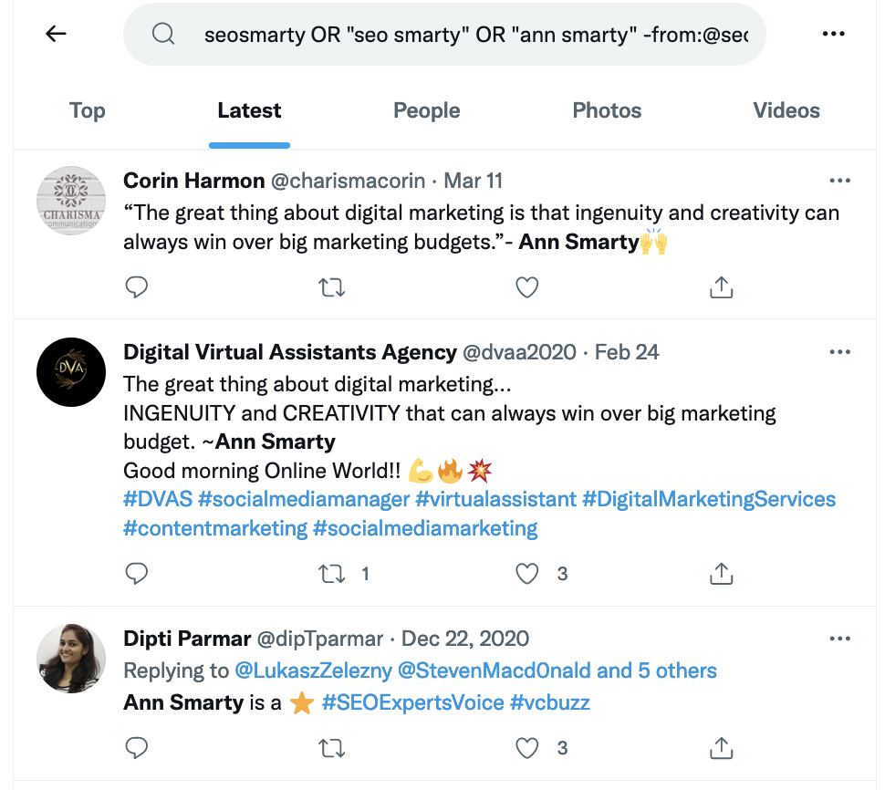 - Monitora i nomi del tuo CEO/fondatore o qualsiasi altro rappresentante pubblico. Vorrei anche tenere d'occhio le citazioni di "ann smarty"