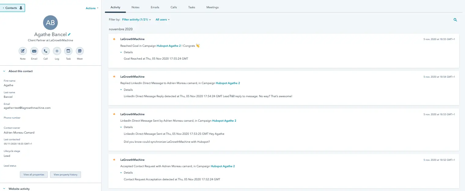 È semplice, attivando la sincronizzazione HubSpot CRM di La Growth Machine, avrai una visione completa di tutte queste informazioni nella timeline dei tuoi contatti.
