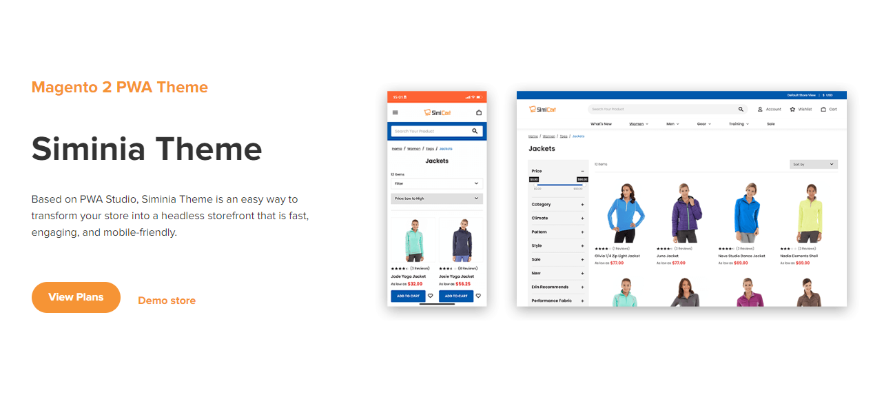 Con Siminia, puoi facilmente implementare la soluzione PWA headless nel tuo negozio. E il tema Siminia mira a essere stabile e facile da mantenere, quindi non devi preoccuparti dei futuri aggiornamenti della versione di Magento.