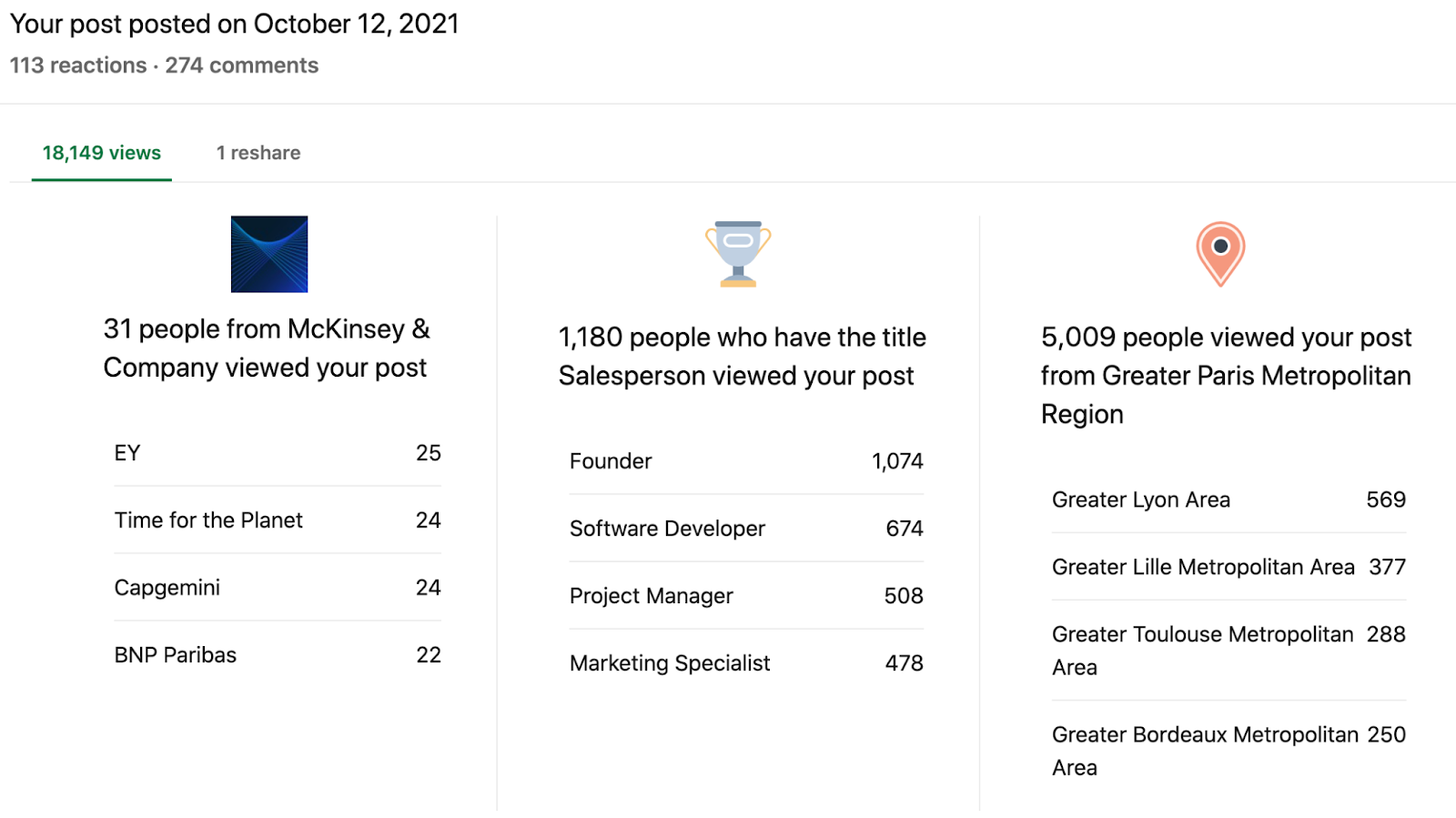 Ora che il tuo profilo è pronto, puoi iniziare a rivedere le tue analisi dei post. (Se non hai ancora alcun post, ci vorrà del tempo per compilare queste informazioni.) Quando fai clic sul numero di visualizzazioni sotto un post che hai pubblicato, puoi visualizzare i dettagli su coloro che hanno interagito con esso: