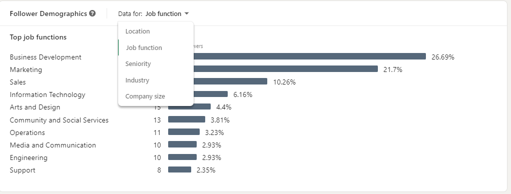 Usa queste analisi di Linkedin per saperne di più su chi segue la tua azienda e ti dirà quale tipo di contenuto devi pubblicare per loro. Oppure, ti dirà che stai prendendo di mira le persone sbagliate con ciò che dici e pubblichi e puoi iniziare a determinare dove puoi apportare modifiche.