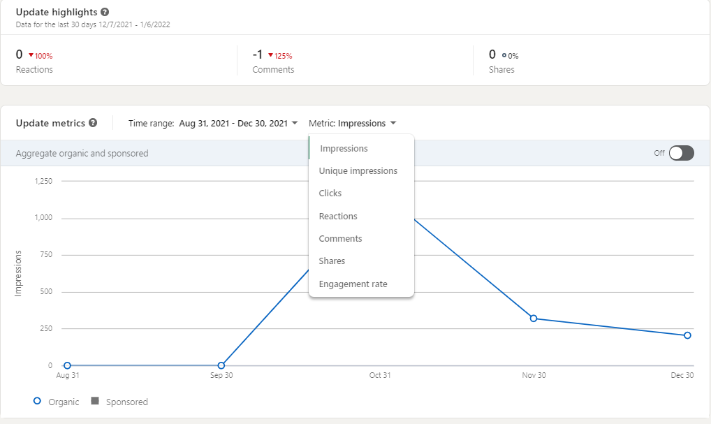 Nella pagina della tua azienda, potrai anche trovare l'analisi degli aggiornamenti che ti offre una panoramica di tutti i post. Puoi filtrare per data e tipo di metrica da Impressioni a tasso di coinvolgimento. Questa è la tua visuale a volo d'uccello per aiutarti a vedere come sei migliorato o diminuito nel tempo.