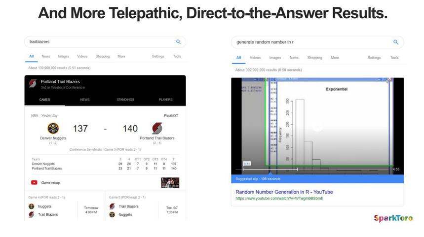 - Google sta migliorando nel risolvere le ricerche, eliminando sostanzialmente la necessità di più query sullo stesso argomento e mostrando le risposte direttamente nella pagina dei risultati di ricerca. Ciò preclude la necessità di fare clic sui risultati effettivi. Google ripubblica i contenuti, a volte con un credito minimo, a volte senza alcun credito. Fondamentalmente, ora non è necessario fare clic su un collegamento per ottenere informazioni chiave da un articolo o per riprodurre un video. Puoi farlo direttamente dalla pagina dei risultati di ricerca: