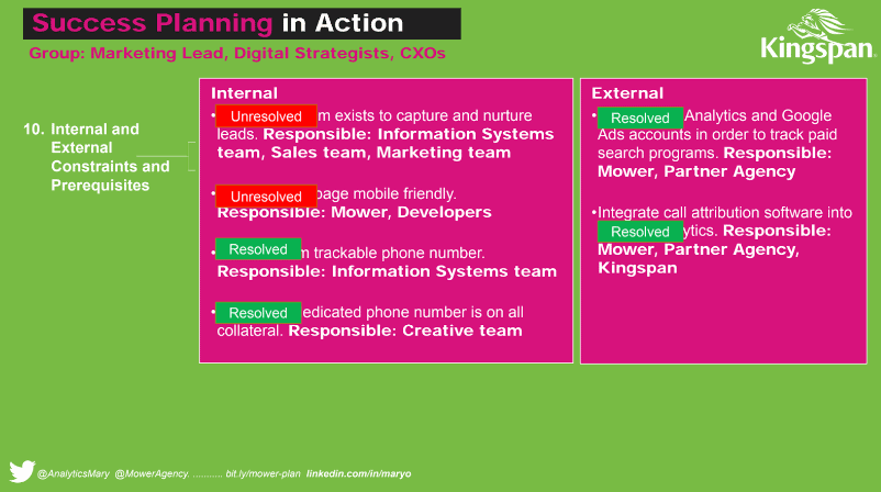 Mary ha condiviso uno straordinario quadro di misurazione per allineare le attività di marketing con gli obiettivi di business di un'azienda. Il suo Piano di successo dimostra il valore degli investimenti di marketing e analisi alla dirigenza senior, misura le cose giuste, definisce chi è responsabile di cosa, stabilisce in anticipo i migliori KPI della categoria, promuove l'adesione e la collaborazione tra team e dipartimenti per progetti di marketing, ed espone le aree di rischio prima che il denaro venga speso.