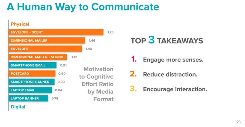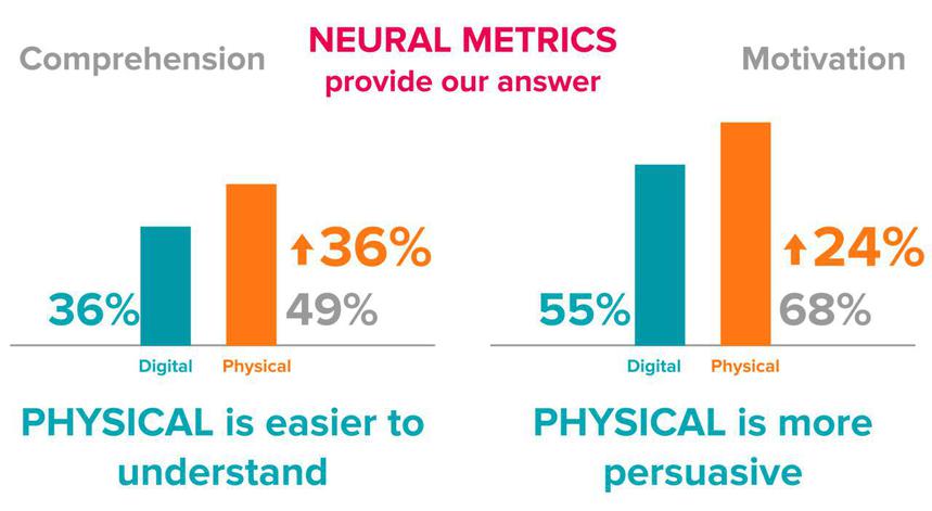 Secondo una ricerca di Diana e Ferdinand, le promo digitali attirano il 38% in più di attenzione rispetto a quelle fisiche; d'altra parte, gli annunci fisici portano a un ricordo del marchio superiore del 70%. Questo accade perché le interazioni fisiche sono più facili da capire e sono più persuasive: