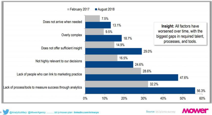 Esistono diversi fattori che impediscono alle aziende di utilizzare più spesso l'analisi di marketing nel processo decisionale. La mancanza di professionisti qualificati e la mancanza di strumenti e processi per misurare l'impatto delle analisi di marketing sono i maggiori ostacoli: