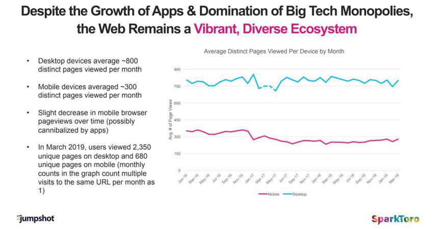 Le alternative a Google stanno conquistando quote di mercato, ad esempio Facebook, Instagram, DuckDuckGo, YouTube e Amazon. Non puoi davvero vedere che sta succedendo, dal momento che Google ha ancora la quota più grande del mercato. Ad esempio, la ricerca di hashtag di Instagram è cresciuta di circa 2,5 volte rispetto all'anno passato su desktop (in un momento in cui la condivisione desktop delle sessioni in generale si è ridotta). Tuttavia, è meno dello 0,1% del volume di ricerca desktop di Google.