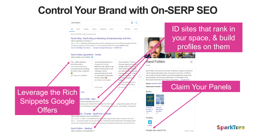 - Controlla il marchio con la SEO on-SERP, poiché la pagina dei risultati di ricerca è la tua nuova pagina di destinazione. Devi sfruttare i rich snippet e rivendicare i tuoi pannelli. Di seguito è riportato un esempio di una pagina dei risultati di ricerca quando si utilizza Google "Rand Fishkin":