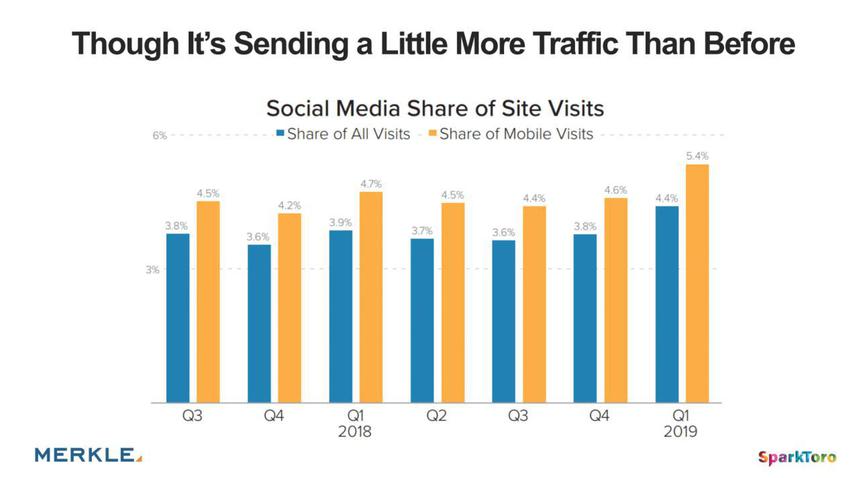 Social traffic still accounts for less than 10% of traffic (according to Jumpshot), even though it has been sending more traffic than before:
