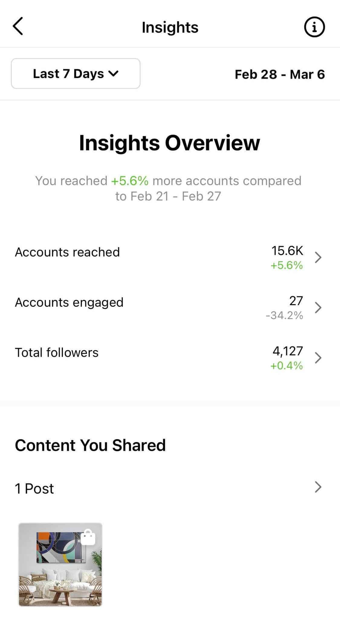 I rapporti possono essere molto utili per dare forma alla tua strategia sociale. Alcuni canali hanno la loro funzionalità di reporting integrata che può aiutarti a scoprire di più sul tuo pubblico e sul rendimento dei tuoi post. Questo può essere utile, tuttavia, i dati sono in genere limitati, come possiamo vedere nell'esempio di Instagram Insights di seguito.