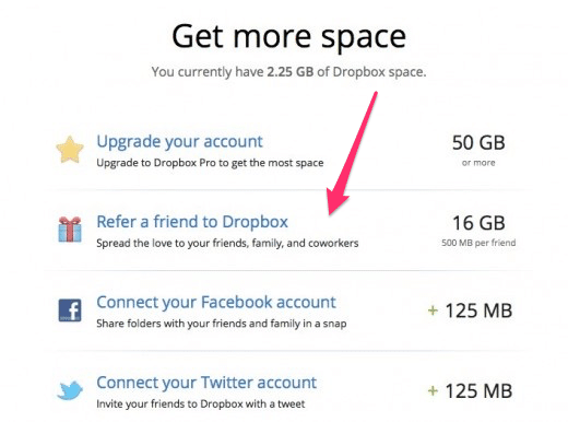 Guarda come Dropbox promuove il suo programma di referral marketing e incoraggia l'uso di molti canali diversi:
