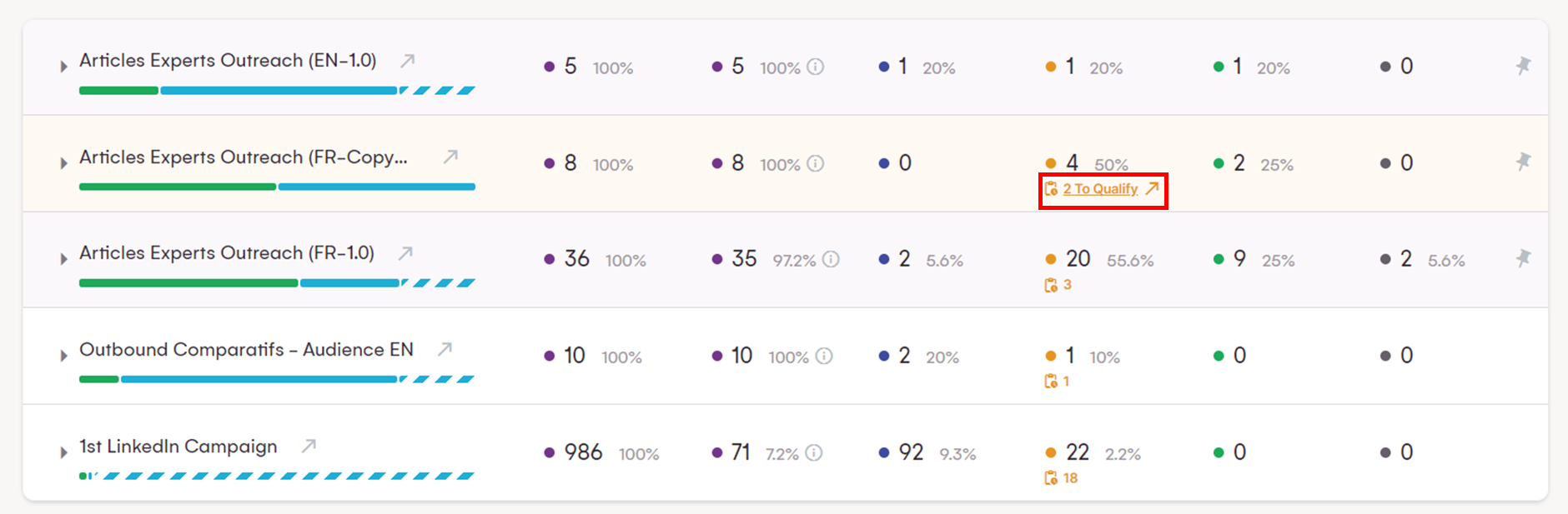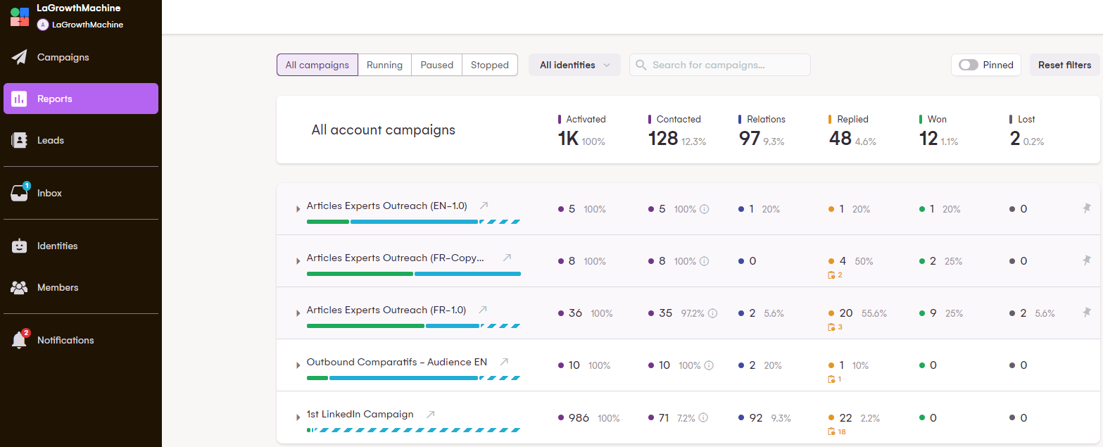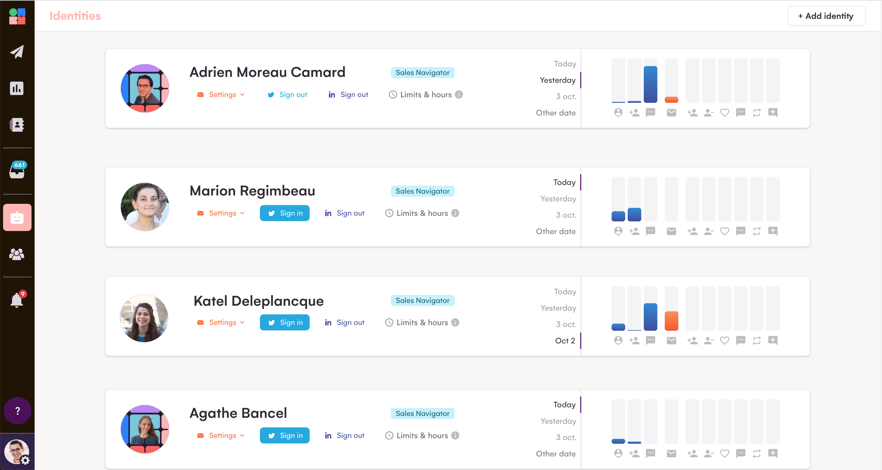 Puoi monitorare la loro attività all'interno di ciascuna delle loro campagne, a livello della scheda Identità, il numero di azioni che hanno eseguito, il numero di lead generati e attivati, ecc.