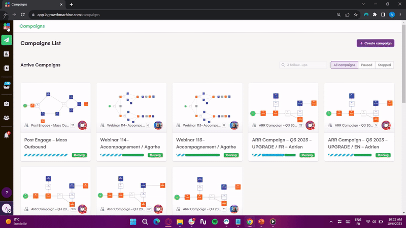 Queste campagne vengono generalmente lanciate da più account Higher-Up diversi, ma solo una persona le gestisce; il nostro responsabile delle vendite, Adrien. È lui che avvia e supervisiona tutto ciò che riguarda queste campagne; dal copywriting alla gestione delle risposte, ecc.