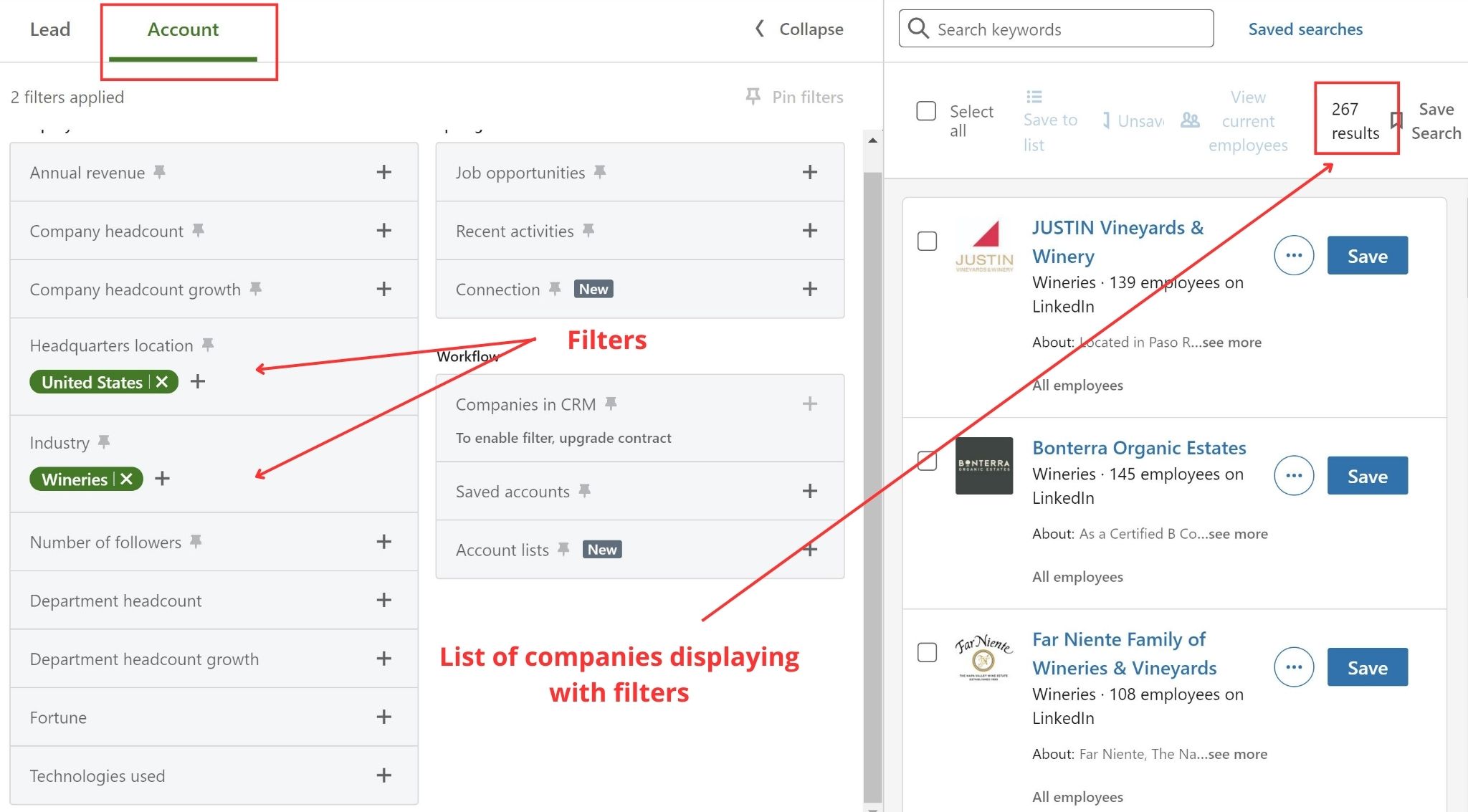 LinkedIn Sales Navigator funziona in modo leggermente diverso. Per cercare le aziende, devi andare alla scheda dell'account.