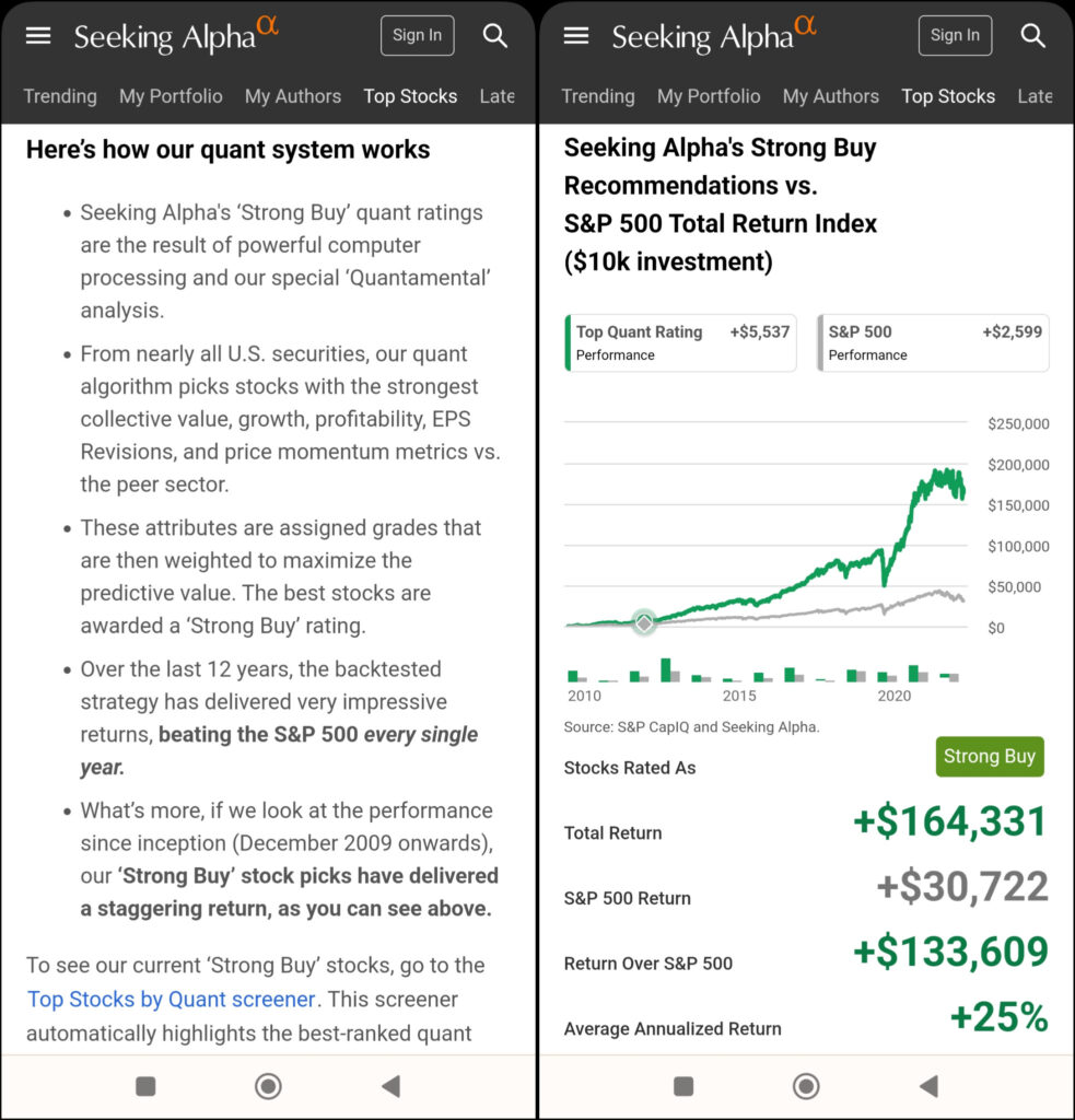 Sì – Vale la pena abbonarsi alla ricerca di Alpha Premium. Le scelte azionarie di Seeking Alpha hanno sovraperformato in modo affidabile l'S&P 500 , in particolare le scelte Strong Buy. Da quando Seeking Alpha è stato lanciato nel 2004, ha registrato rendimenti in media superiori del 24% rispetto all'S&P 500.