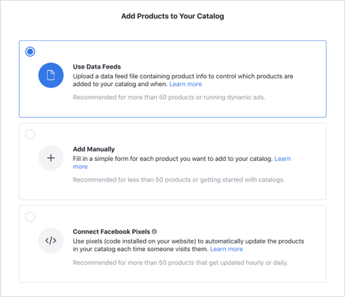 - Aggiungi i tuoi prodotti al tuo catalogo caricando un feed prodotto o inserendo manualmente ciascun prodotto.