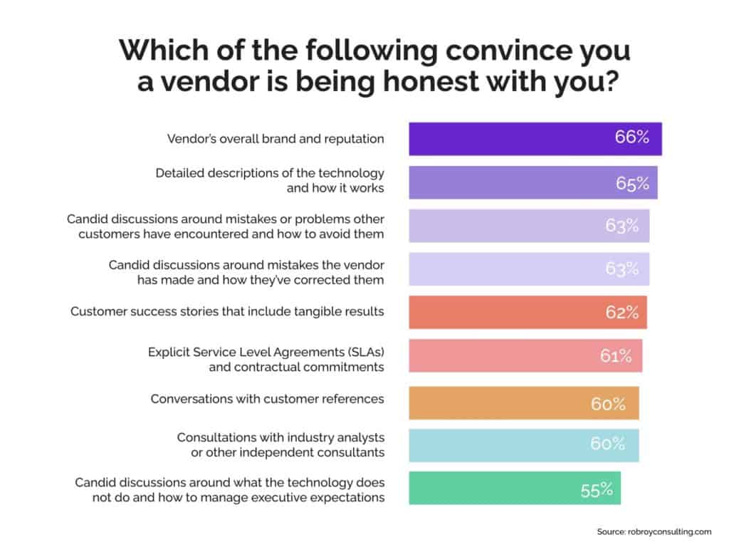 Pubblicato: 2022-05-28La fiducia rimane un problema per gli acquirenti di tecnologia. Alla domanda fino a che punto ritengono che i fornitori di tecnologia siano onesti con loro, il 73% ha ritenuto che la maggior parte dei fornitori di tecnologia non fosse all'altezza, secondo un sondaggio condotto da Cambia Information Group. Quindi cosa interessa soprattutto agli acquirenti nel 2022? La risposta semplice è il passaparola .