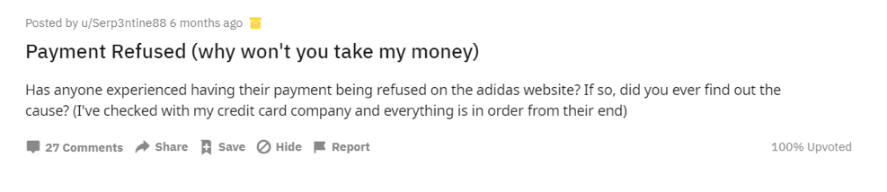 一部のユーザーは、支払いの準備ができていると不満を言っていますが、クレジットカードは拒否されました。 このアディダスの顧客が報告したように、「なぜあなたは私のお金を取らないのですか?」 これは、不快な体験を生み出し、収益の損失につながる一般的なシナリオです。
