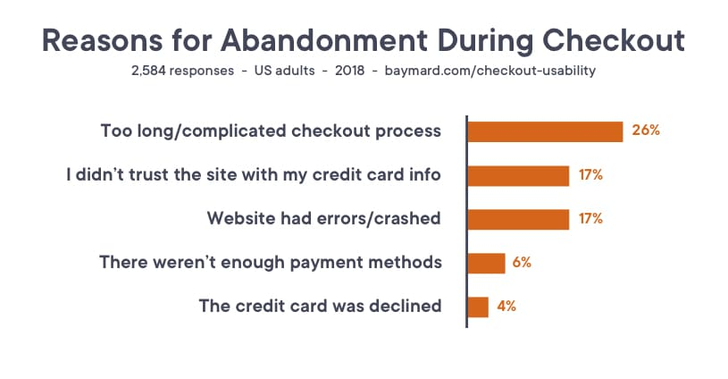 Baymard Instituteの調査によると、平均的なチェックアウトフローには約15のフォームフィールドがあります。 それがUXデザインの場合である場合、顧客は去る可能性があります。 この威圧的なプロセスを約60%削減して、最小限のチェックアウトデザインを作成できる、信頼できるユーザーエクスペリエンスエージェンシーに相談してください。